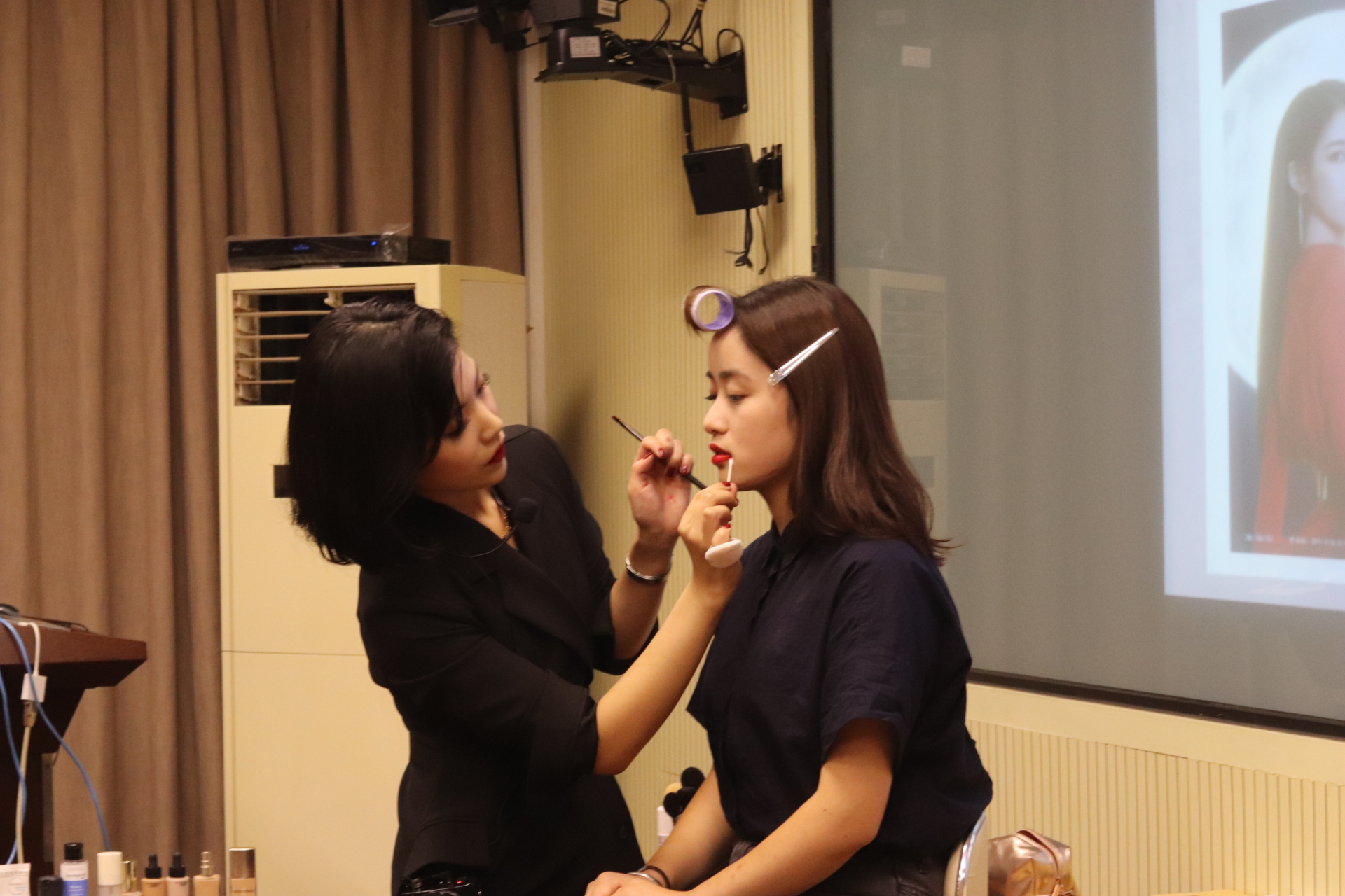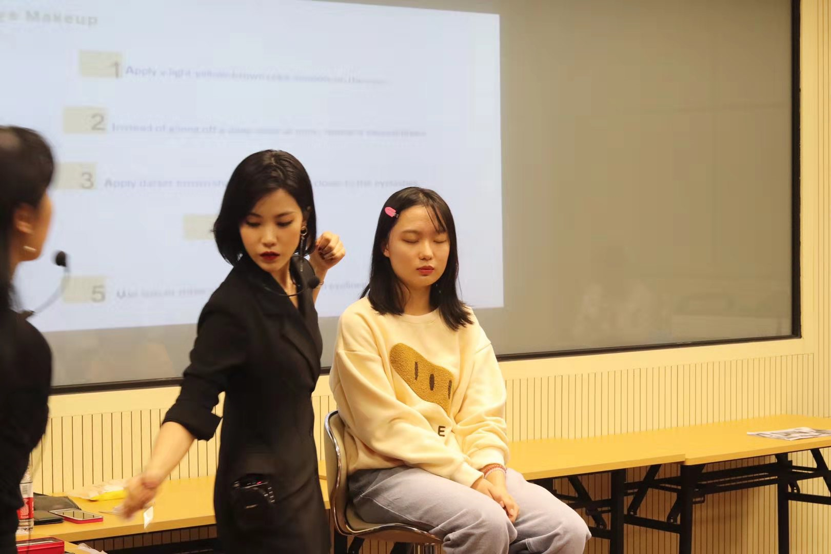 金老師對韓國和中國關于美妝的特點進行了講解。以中韓著名的女星妝容為例與現場同學一起討論了中韓妝容的差異。