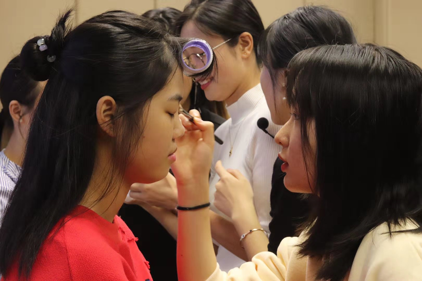 金老師以現場選中的同學為模特 ,對熱播劇《德魯納酒店》中的妝容進行了仿妝教學。